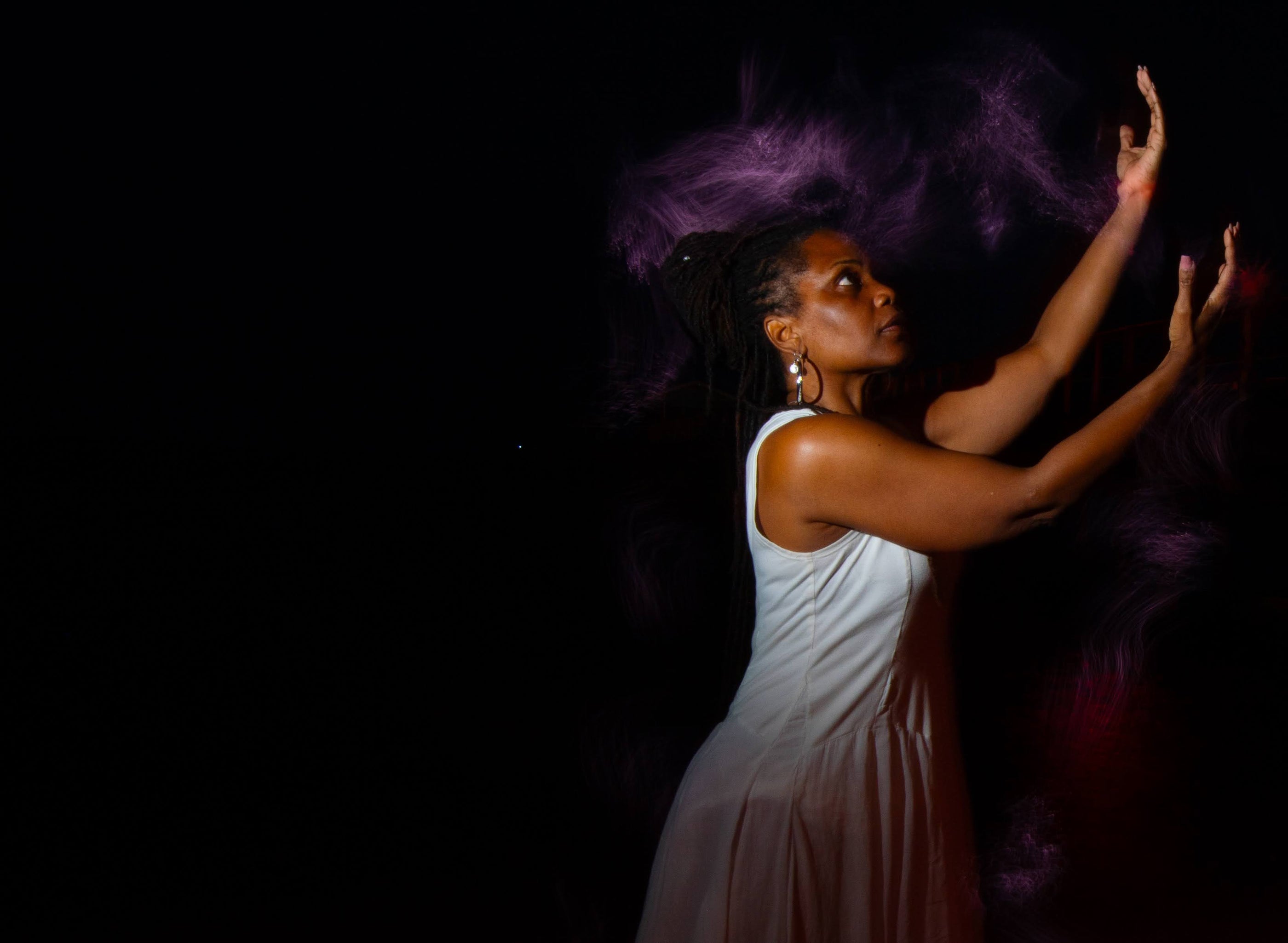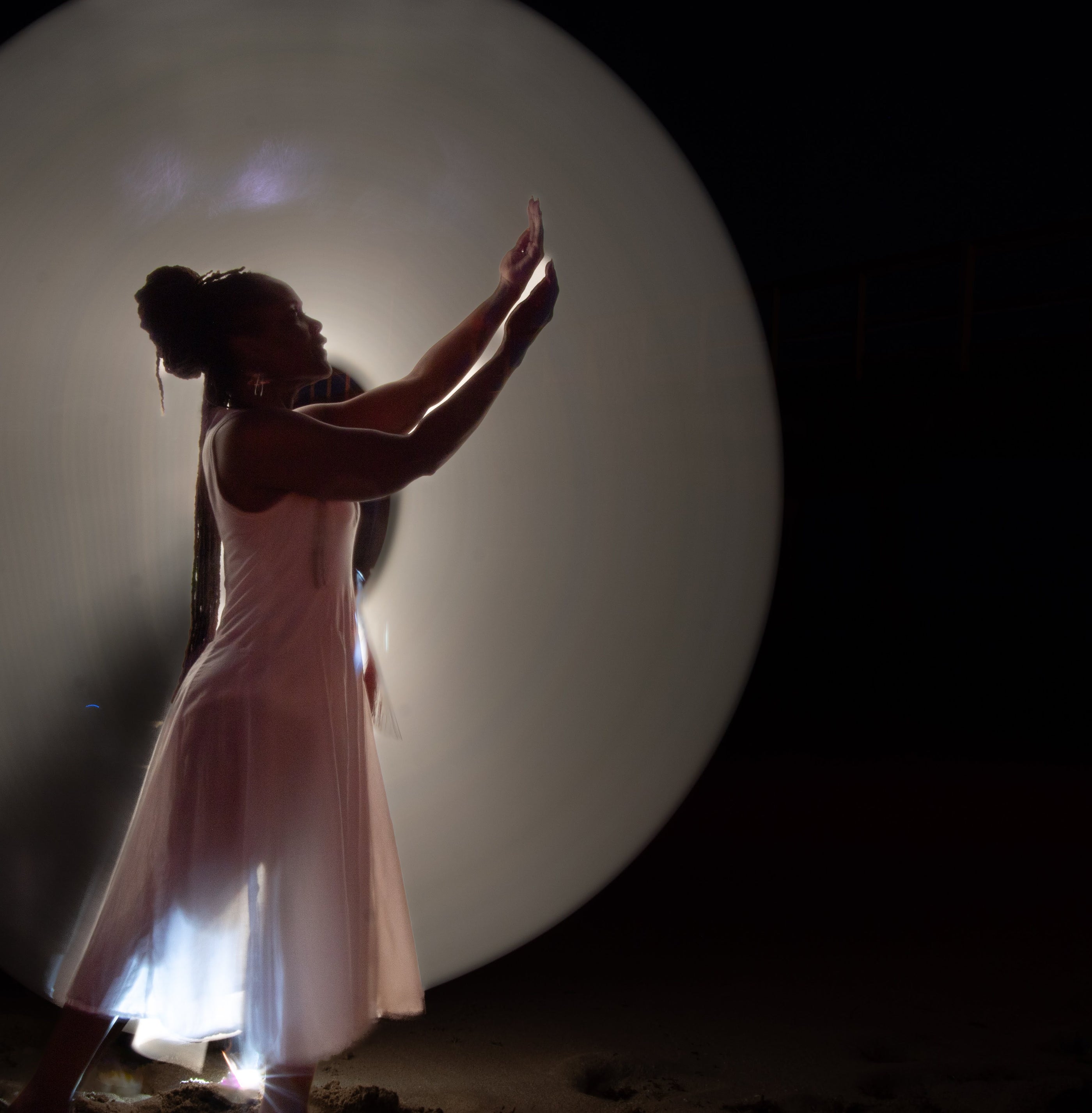 This exploration extends to a series of self-portraits, which became a personal ritual of movement and creation. Drawing from movements learned in African dance class, I used my entire body to paint with light, mirroring the same physical, large-scale process I use in my oil paintings.